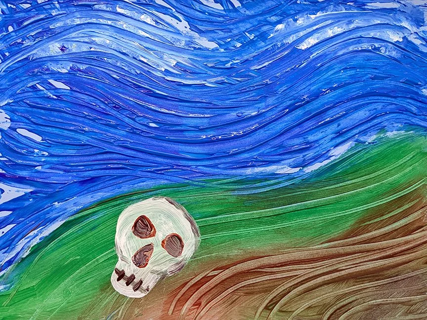 Beyond the Canvas Advance Lessons are for students 6th-8th grades. They explore many concepts from composition, realistic, positive/negative and more. Students experiment with many mediums from oil pastels, watercolor, tempura, chalk, and mixed. Images are examples of various student artworks.