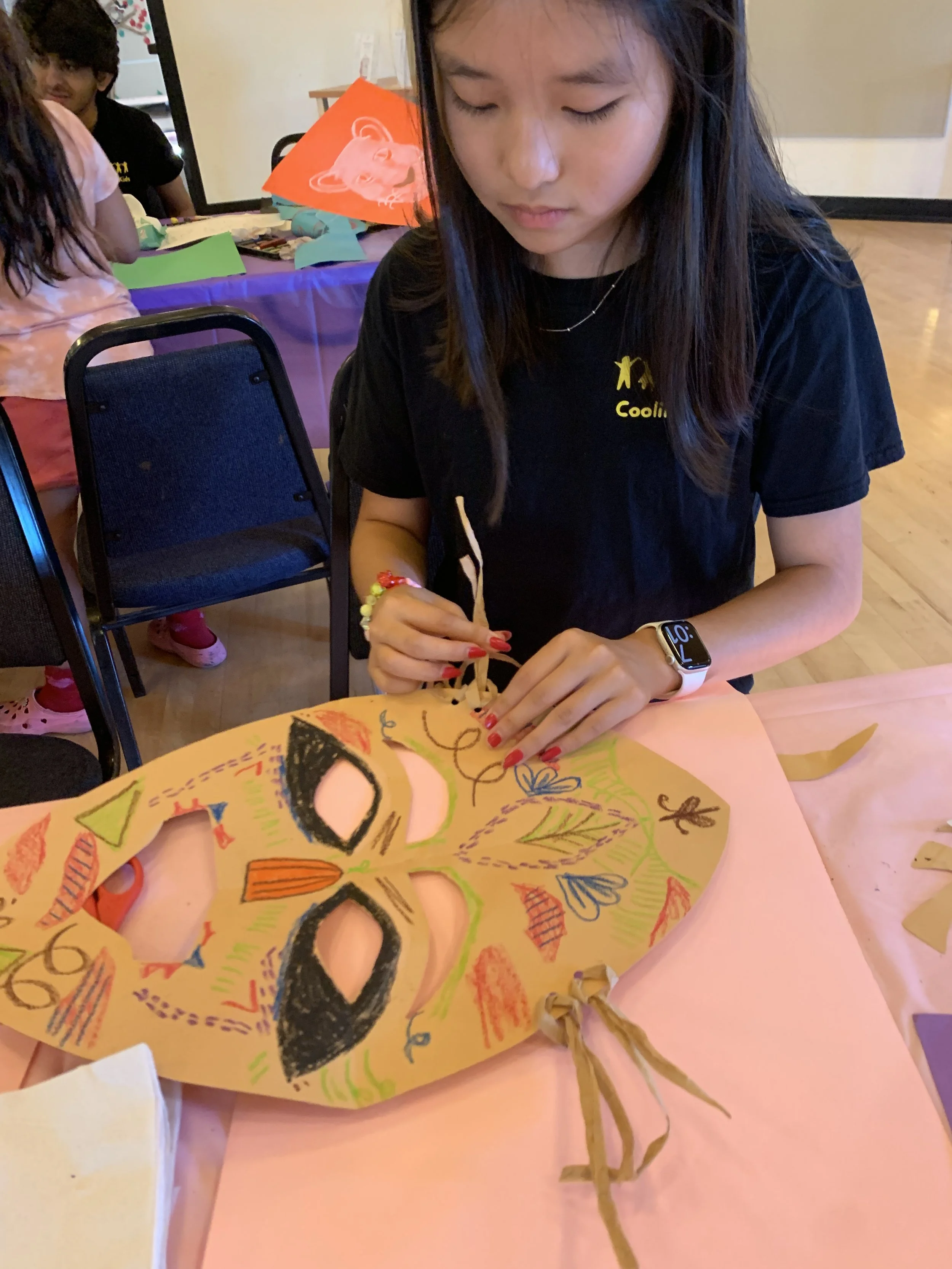 Art in Action partnered with Cooline Kids Camp for an evening of art and storytelling at the Girls’ Club of the Mid-Peninsula in Palo Alto. Inspired by Lioness E author Evelyne Keomian, campers and families created lion drawings and Banda masks, celebrating creativity, community, and youth leadership.