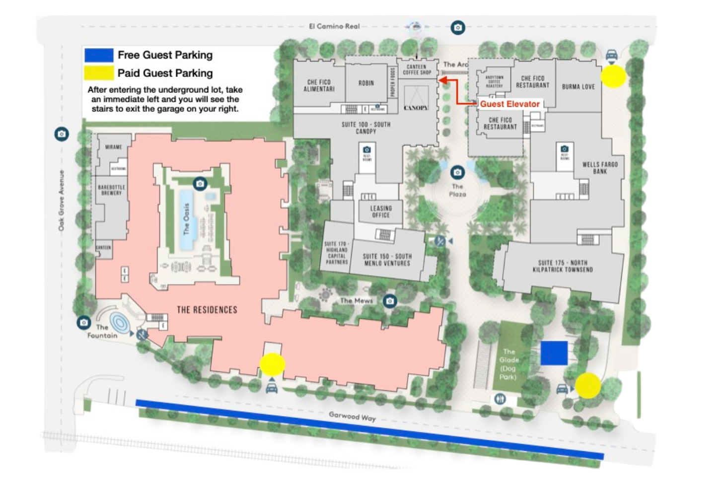Parking Access:Upon entering the premises via El Camino Real, please proceed to the guest elevator labeled "SHOPS" in the parking garage.